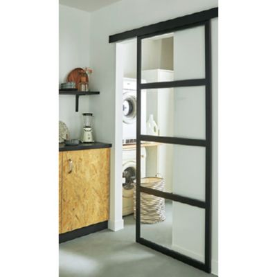 Porte 100x210 cm Bois de pin massif Blanc. Porte coulissante Atelier noir verre givré ARTENS H204 x l73 cm. Avec des portes coulissantes louverture ou la fermeture de vos portes se fera en une seule poussée.